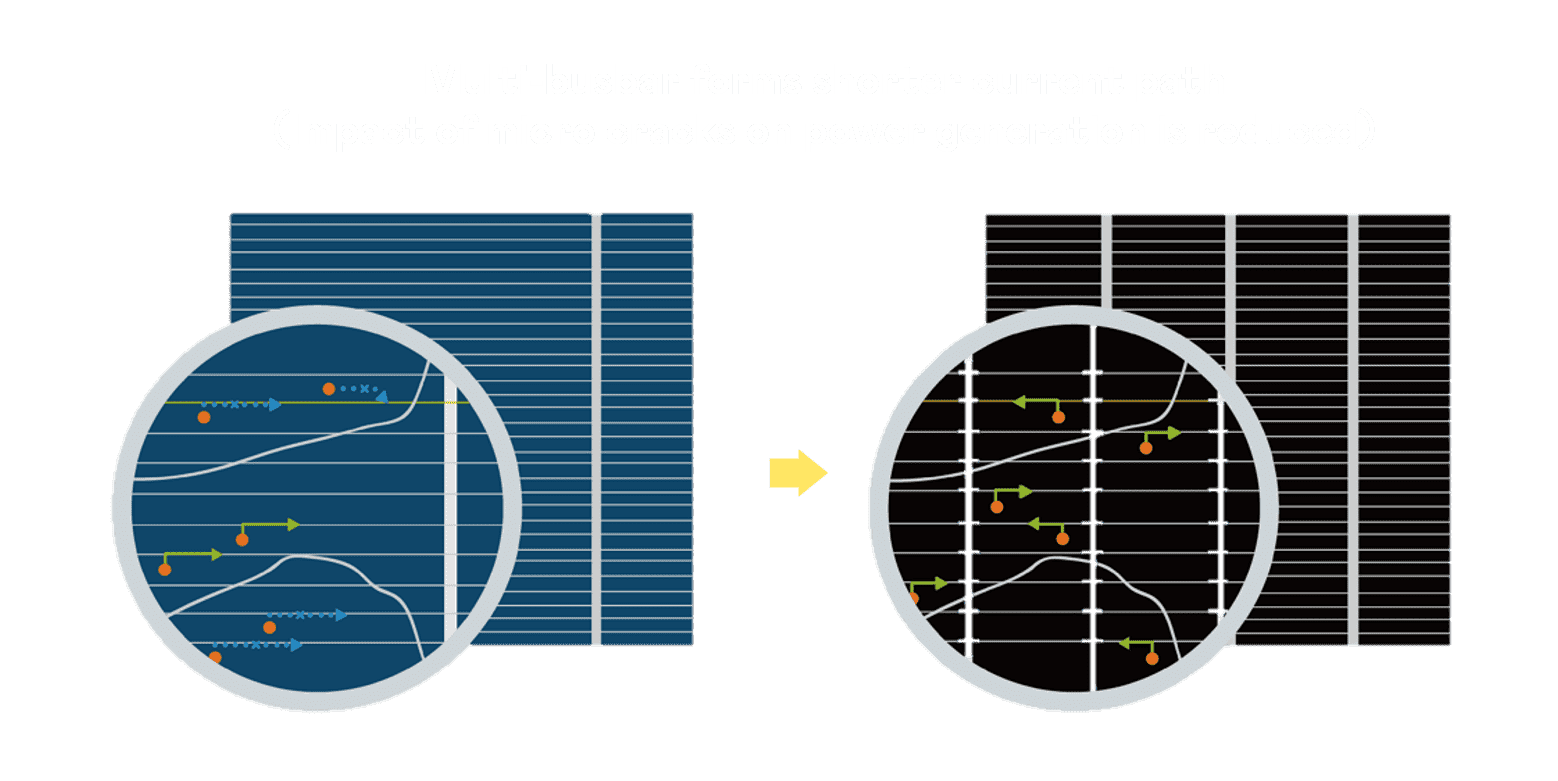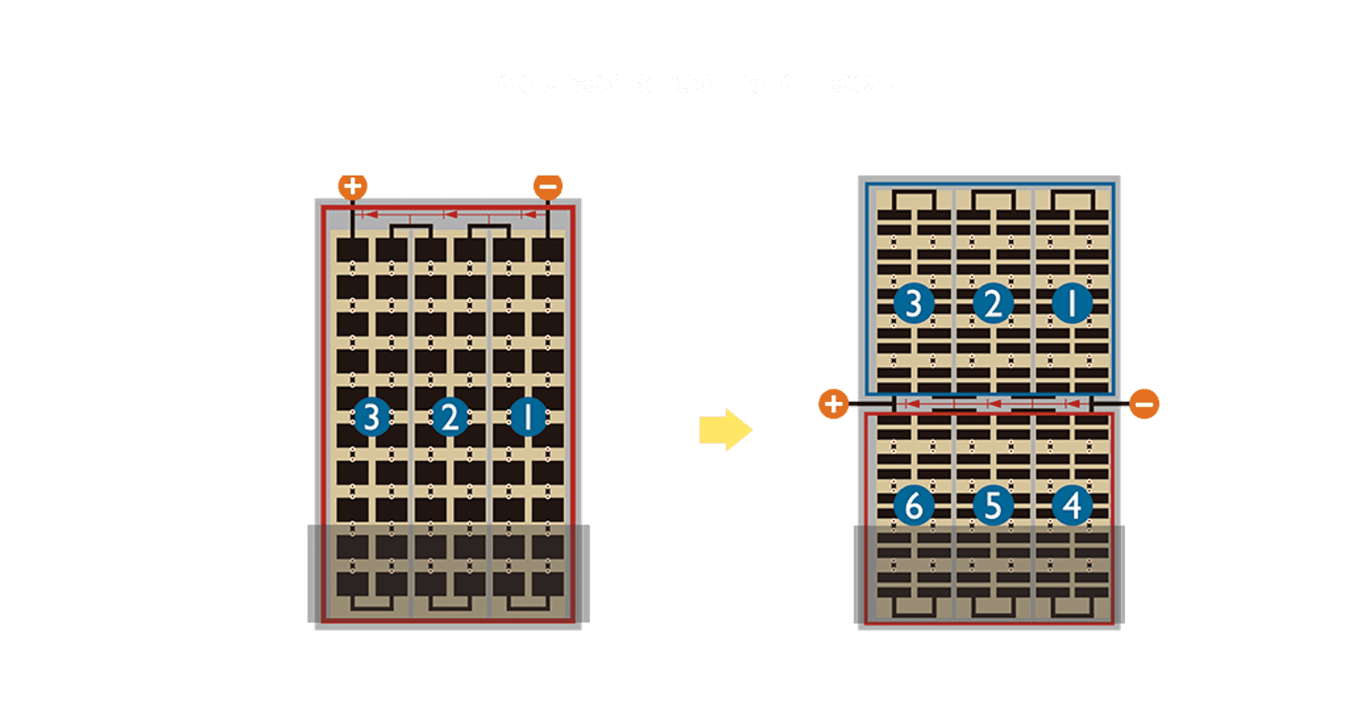 - 结合半切电池,,降低遮阴影响、、、、提升模组抗隐裂能力、、、、并减少电阻损耗,,,进一步提升模组发电效能。。
