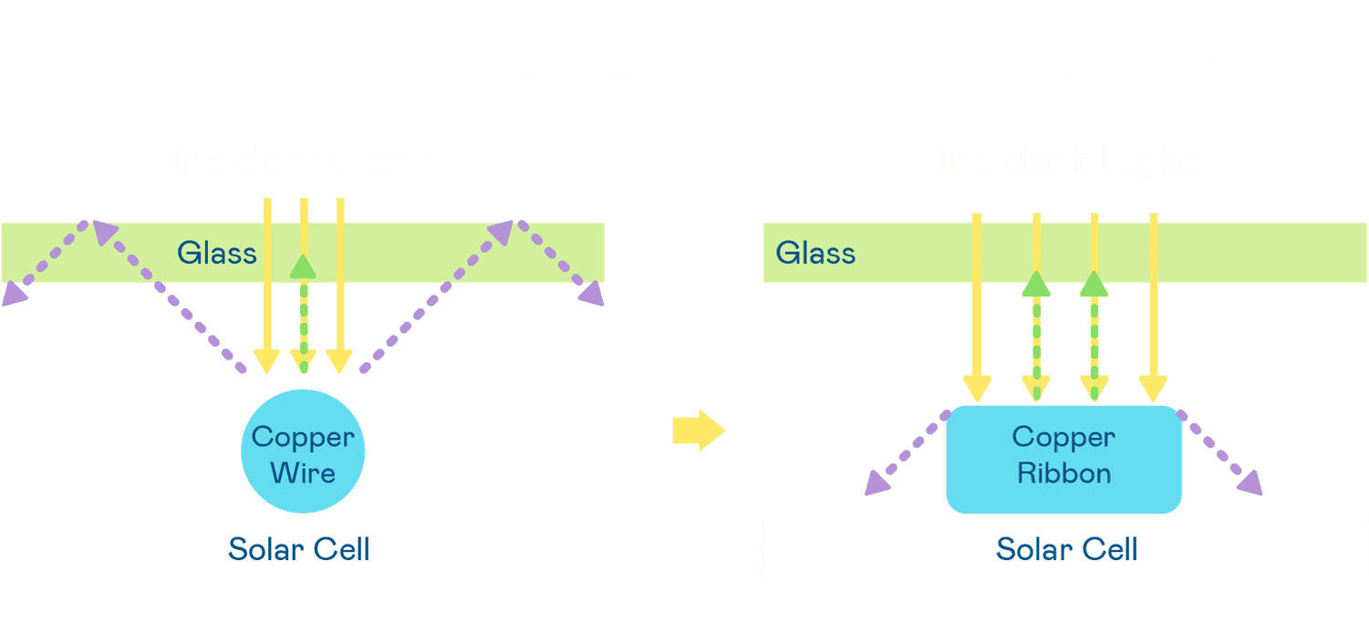 - 电池使用多条铜导线 (Copper wire) 于电池片上形成较短的电流路径,,,,提高电流收集效率,,采用圆形设计的铜导线较传统扁平式的铜焊带 (Ribbon),,,,可增加入射至电池的光线量。。。