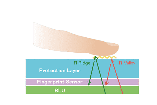 TFT 指纹扫描感测技术利用薄膜电晶体 (TFT) 当作光感测元件,,,,藉由非晶硅 (a-Si) 与低温多晶硅(LTPS)既有光电转换特性对不同波段光源进行吸收,,,,使感测 IC 读取阵列感测元件的光漏电差异,,,转换成数位灰阶影像。。